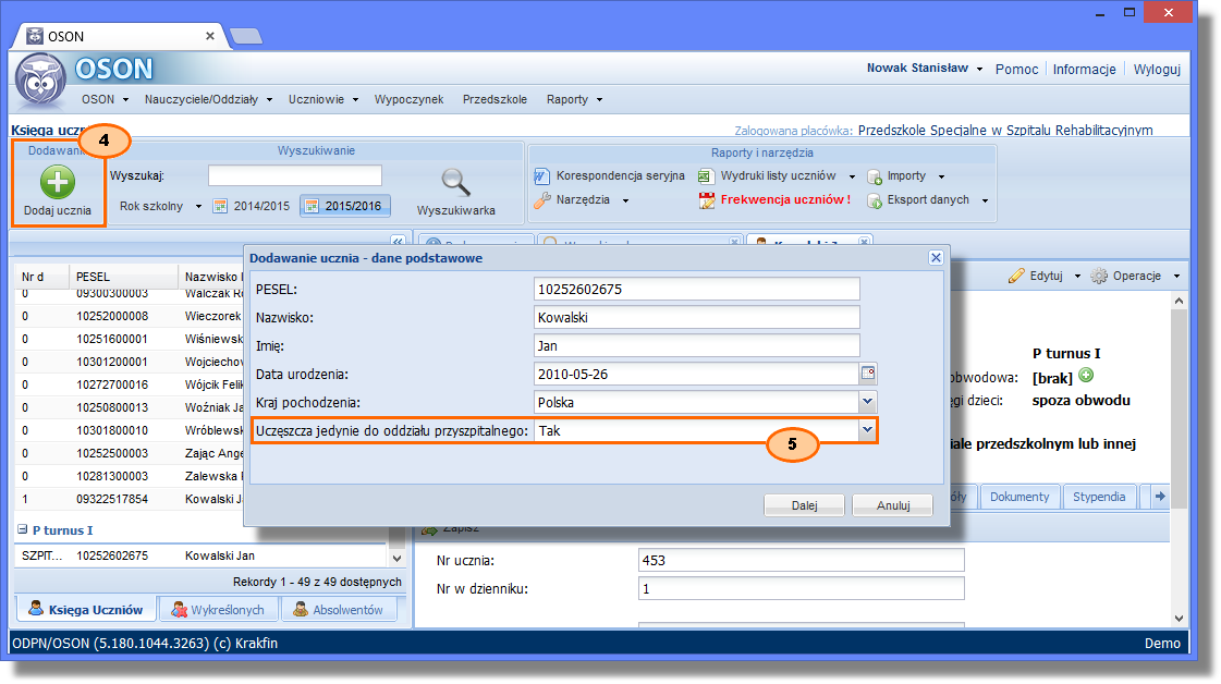 Po dodaniu oddziału przyszpitalnego pojawi się on na liście z oznaczeniem Dodawanie dziecka do oddziału przyszpitalnego Aby dodać dziecko do oddziału przyszpitalnego, należy: 1.w "Księdze uczniów" kliknąć przycisk "Dodaj ucznia" 2.uzupełnić dane ucznia oraz w polu "Uczęszcza jedynie do oddziału przyszpitalnego" 3.kliknąć przycisk "Dalej"
