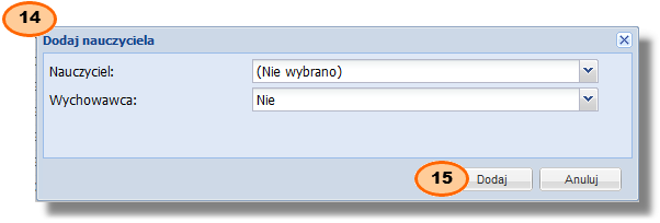 Dodawanie informacji o nauczycielach Aby dodać nauczyciela do oddziału, należy: 1.kliknąć przycisk "Dodaj" 2.w wyświetlonym oknie 3.zatwierdzić przyciskiem "Dodaj"
