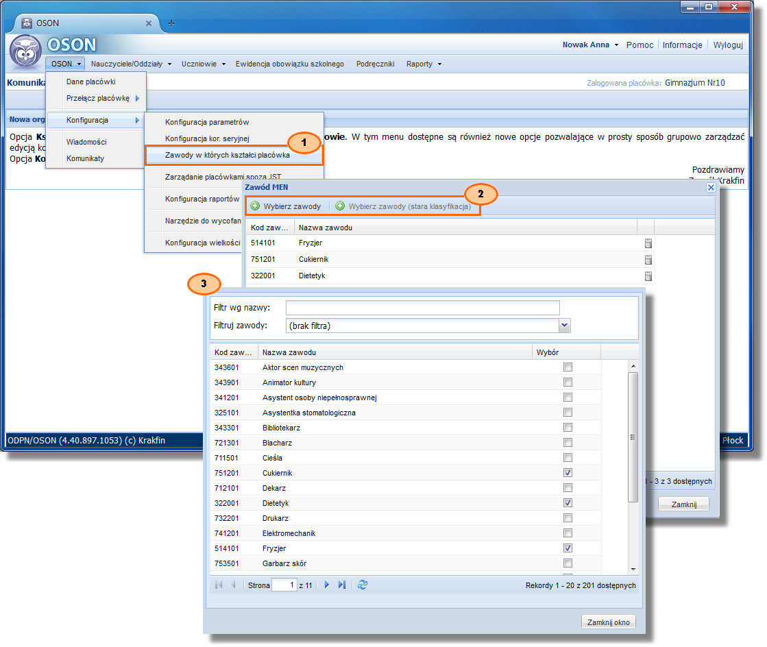 Aby skonfigurować zawody, należy: 1.w menu "Konfiguracja" wybrać "Zawody w których kształci placówka" 2.w nowym oknie kliknąć przycisk "Wybierz zawody" lub "Wybierz zawody (stara klasyfikacja)" 3.w oknie